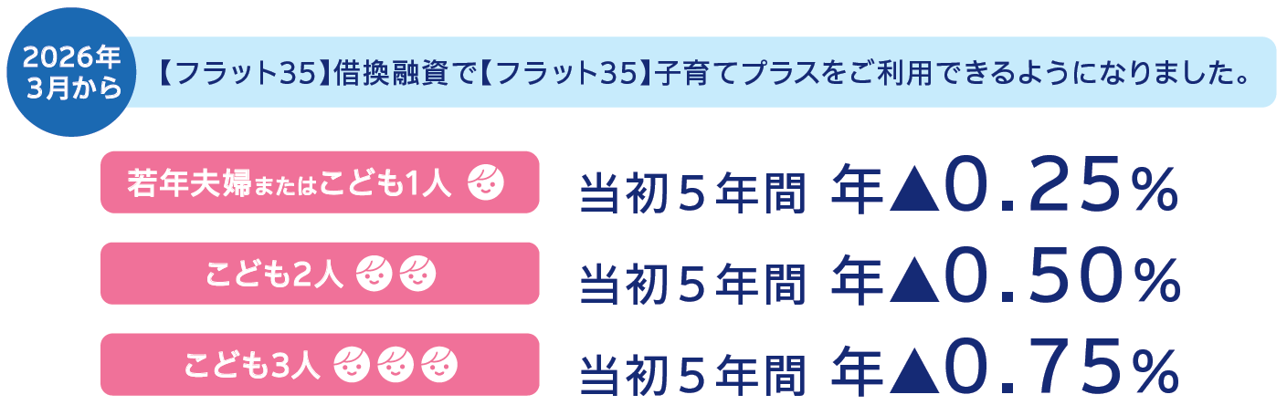 *その他の金利引下げメニューは利用できません。*【フラット35】から【フラット35】への借換で、借換前に【フラット35】子育てプラスによる金利引下げが適用されていた場合、借換後に【フラット35】子育てプラスの利用ができないことがあります。