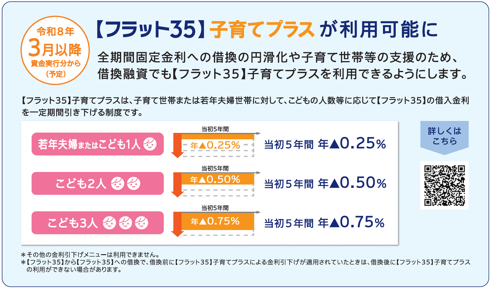 【フラット35】借換融資で【フラット35】子育てプラスが利用可能になります。